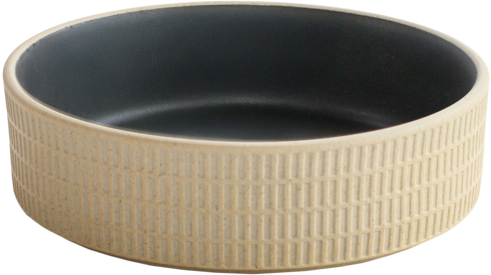 Naczynie z tej linii to doskonały przykład równowagi między estetyką a funkcjonalnością. Wnętrze pokrywa matowa, grafitowa glazura, która w subtelny sposób kontrastuje z piaskową powierzchnią w naturalnym odcieniu beżu. Charakterystyczny, tłoczony wzór na zewnętrznej stronie nie tylko przyciąga wzrok, ale też podkreśla rzemieślniczy charakter produktu.