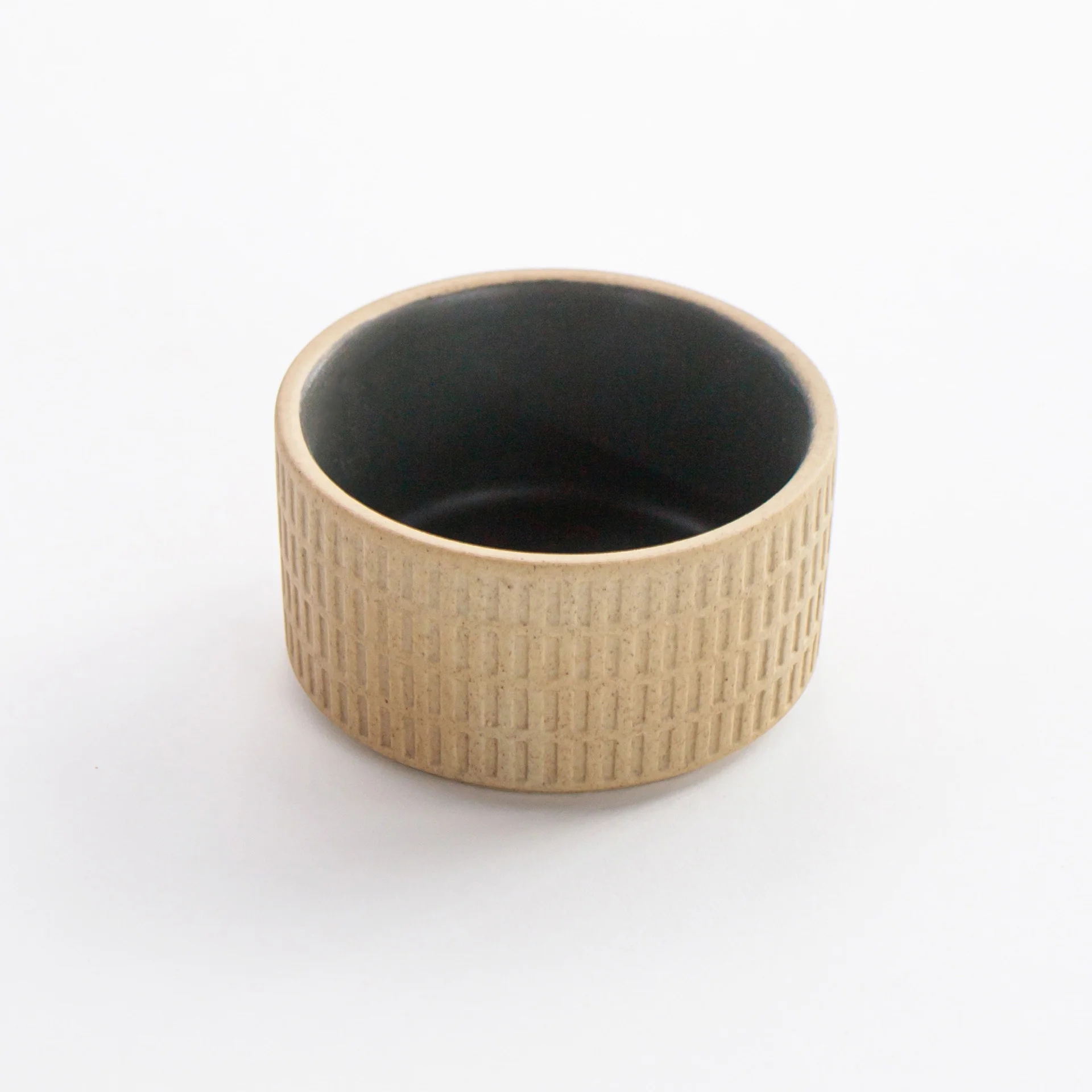 Naczynie z tej linii to doskonały przykład równowagi między estetyką a funkcjonalnością. Wnętrze pokrywa matowa, grafitowa glazura, która w subtelny sposób kontrastuje z piaskową powierzchnią w naturalnym odcieniu beżu. Charakterystyczny, tłoczony wzór na zewnętrznej stronie nie tylko przyciąga wzrok, ale też podkreśla rzemieślniczy charakter produktu.
