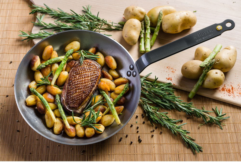 Wykonana ze stali węglowej, zabezpieczona naturalnym woskiem pszczelim, ta patelnia doskonale sprawdza się w smażeniu, grillowaniu i przyrumienianiu potraw. Jest idealna do podkreślania smaku dzięki tzw. reakcji Maillarda, podczas której dochodzi do karmelizacji naturalnych soków na powierzchni żywności, utrzymując jednocześnie jej miękkość w środku. Dzięki temu procesowi potrawy nabierają głębokiego aromatu i intensywnego smaku.