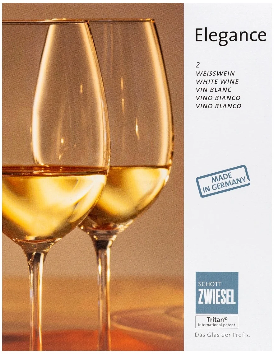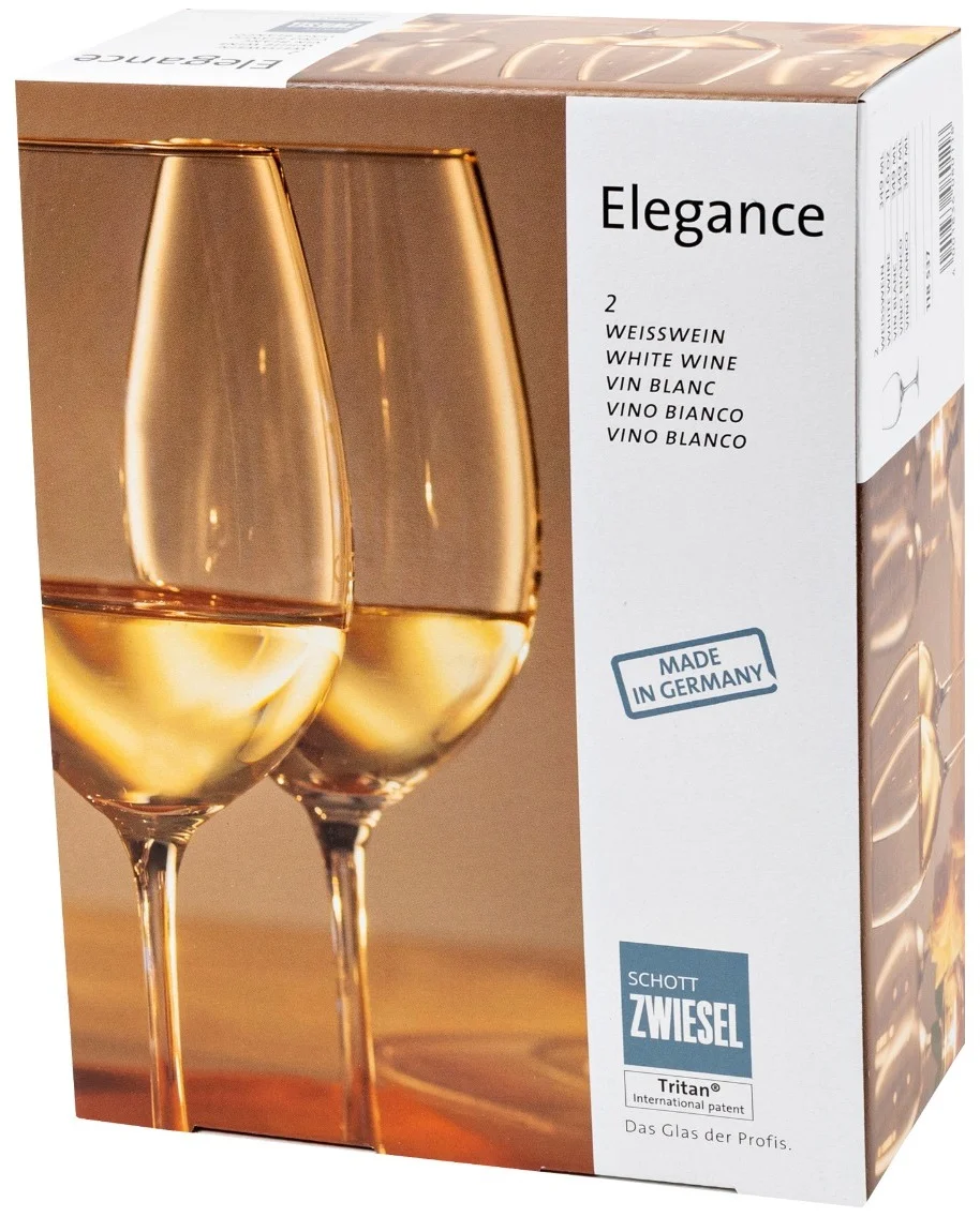 Dwa kieliszki do wina białego - zestaw prezentowy Elegance Schott Zwiesel Limited Edition. Klasyczne kieliszki do wina o ponadczasowym kształcie kielichów opartych na smukłej nóżce. Eleganckie kieliszki są jednocześnie trwałe i ponadczasowe. Seria Elegance przeznaczona jest do serwowania win białych.