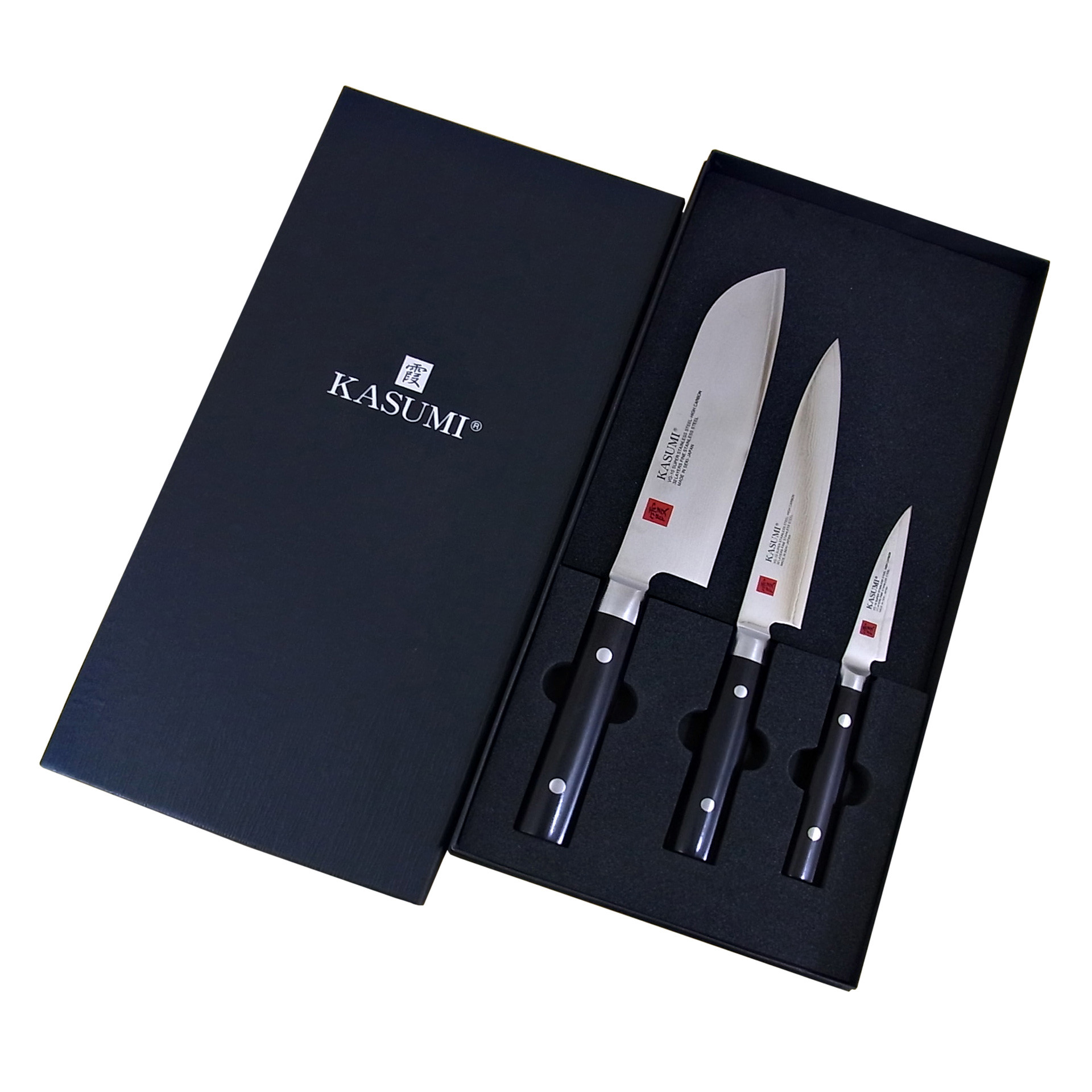 W skład zestawu wchodzi nóż Santoku 18cm, Nóż uniwersalny 15 cm, nóż do oczkowania 8 cm