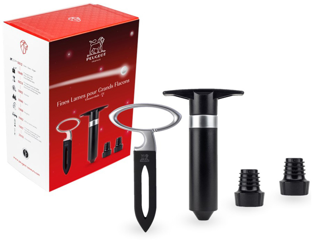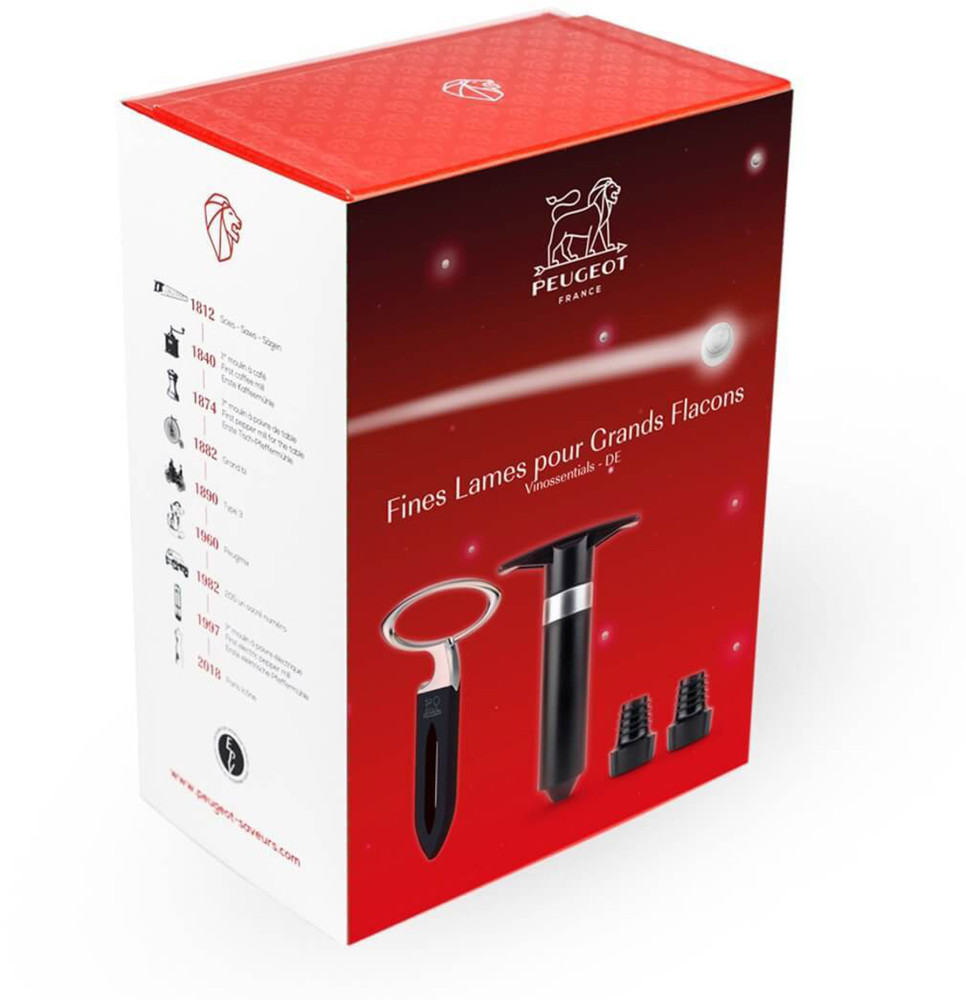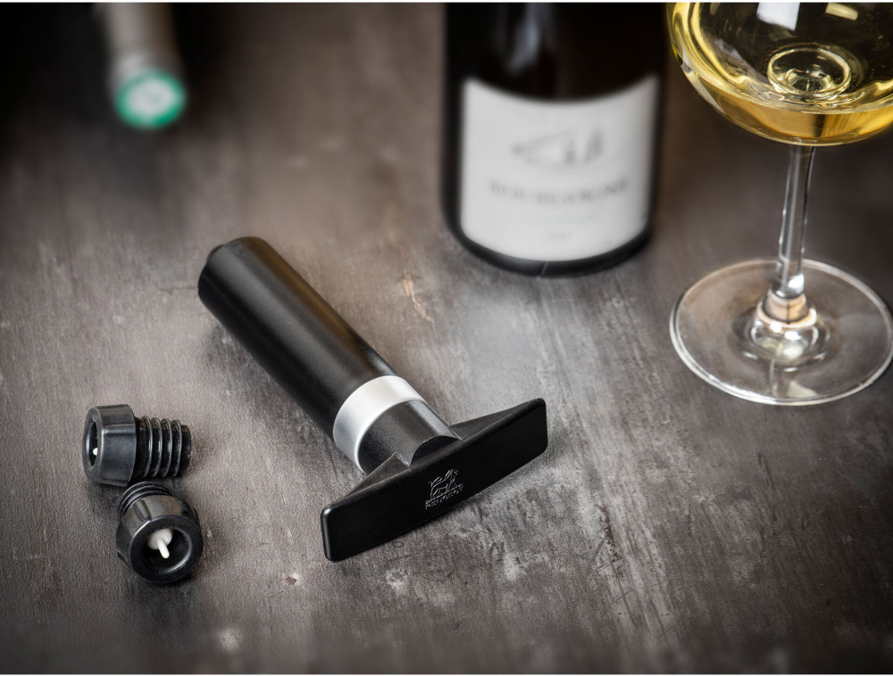 Zestaw VINOESSENTIAL to idealny zestaw dla miłośników rocznikowych win. Zawiera pompkę do wina, otwieracz do starych korków oraz dwa korki próżniowe. Zapakowany w eleganckim pudełku stanowi doskonały pomysł na prezent.